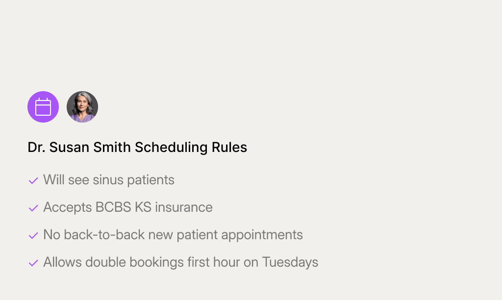 Book appointments following your logic exactly: the right provider, the right appointment type, the right timing. No frustration or retraining, just repeatable workflows.