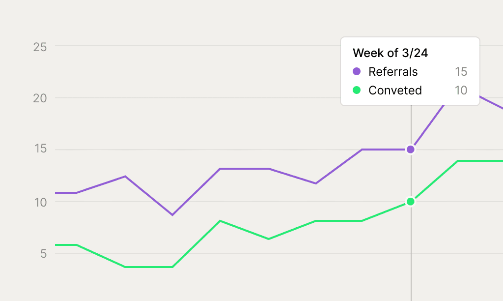 Automated referral tracking. Track week-over-week referral volumes in aggregate, or dive into the data by provider, location, referral source, service line, or payer mix.