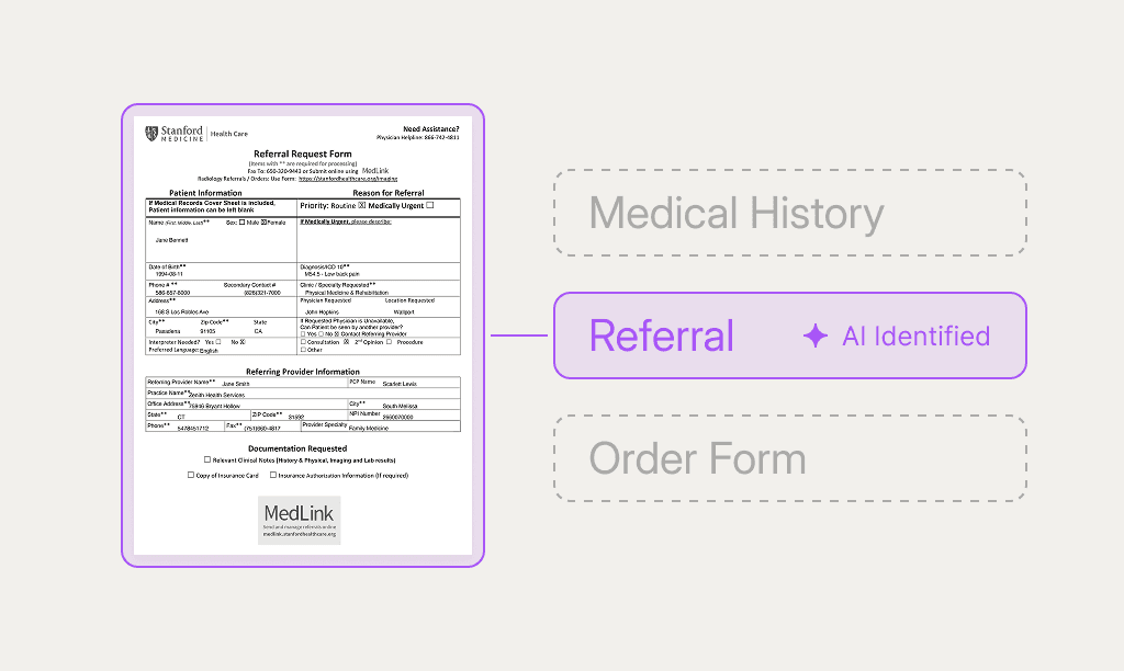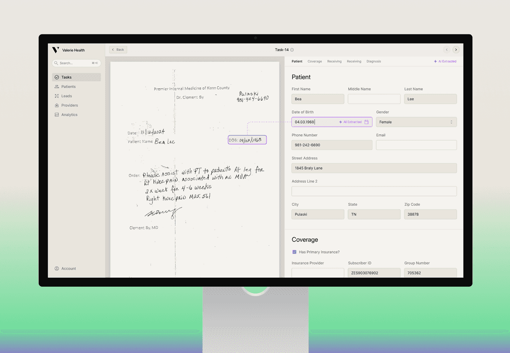 AI-based data extraction. Valerie’s vision language models extract referral information, including patient data, the referring provider, insurance information, etc.